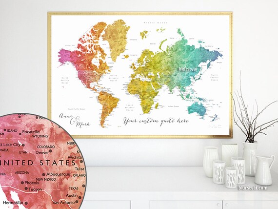 Custom Quote Map Printable World Map With Cities Colorful Etsy