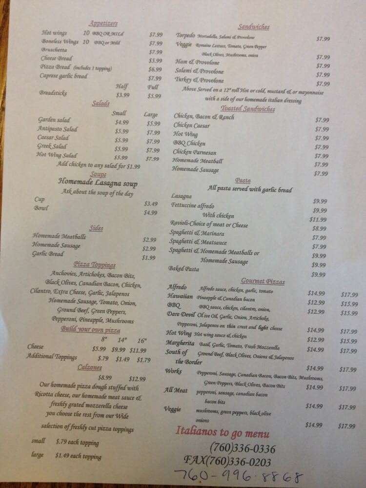 Online Menu Of Italianos Restaurant El Centro California 92243
