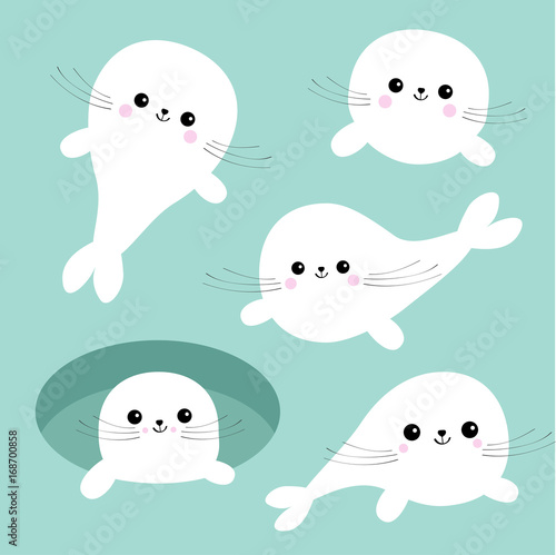 Harp Baby Seal Pup Set Cute Cartoon Character Ice Hole Happy