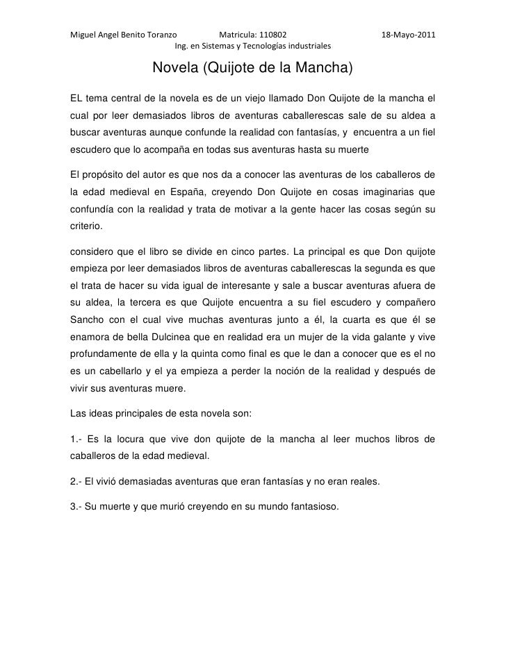Resena De Don Quijote De La Mancha De Miguel De Cervantes Por