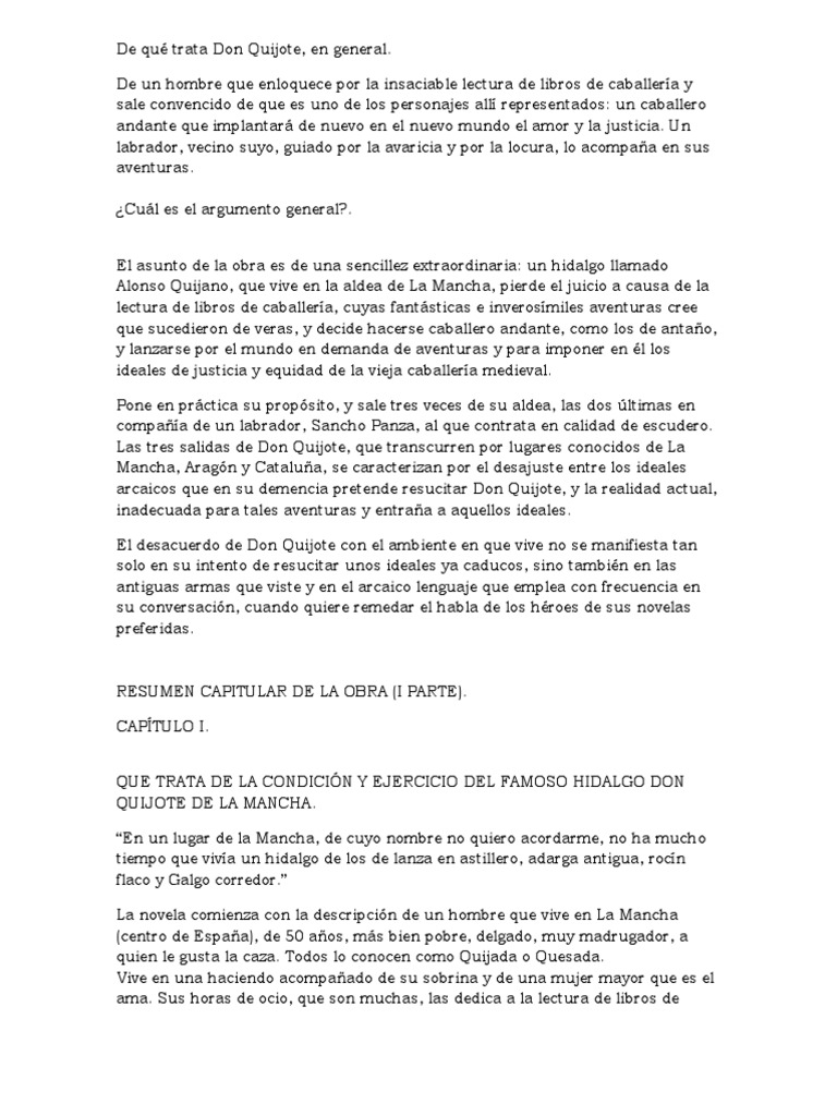 Don Quijote De La Mancha 1a Parte Resumen Por Capitulos Excepto