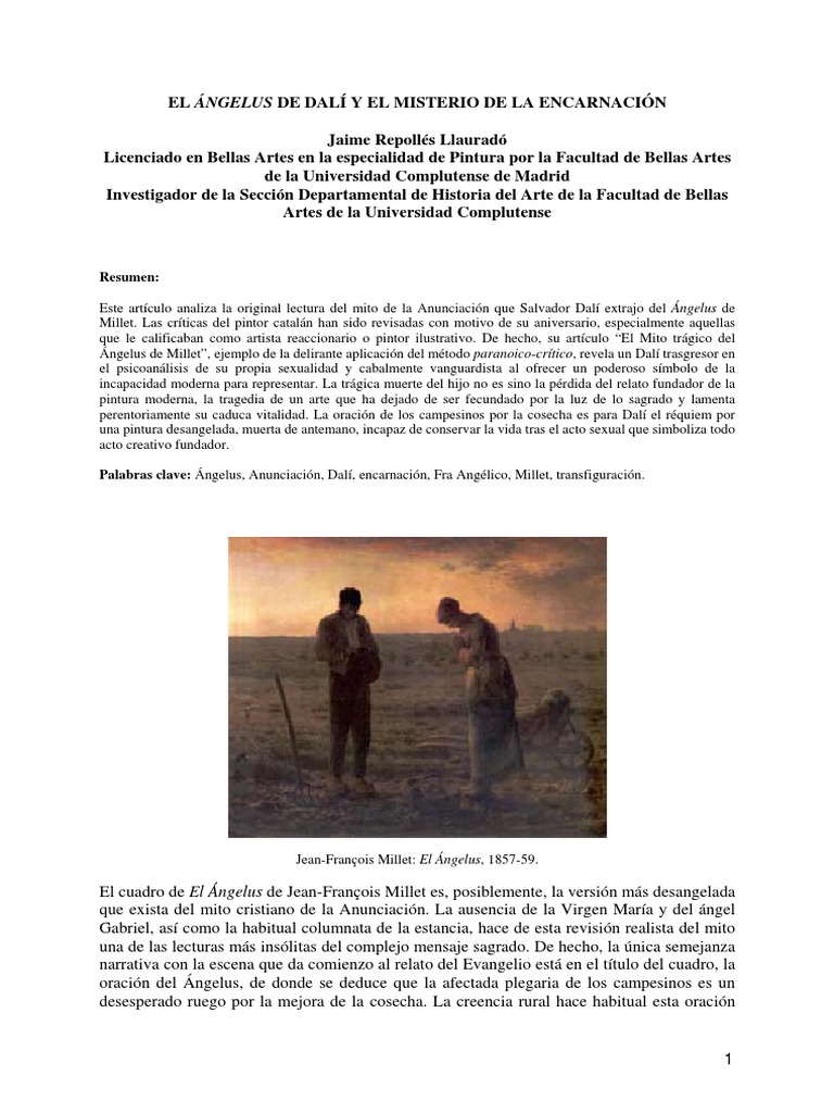 Uno de ellos es el langelus el angelus de millet cuadro ejemplificador de la moralidad cristiana del siglo xix y por el que dali sentia una profunda admiracion. El argumento del angelus de millet demuestra claramente la interpretacion que dali desarrolla del metodo paranoico critico que abarca en numerosas ocasiones el tema de las relaciones sobre el automatismo y los suenos.