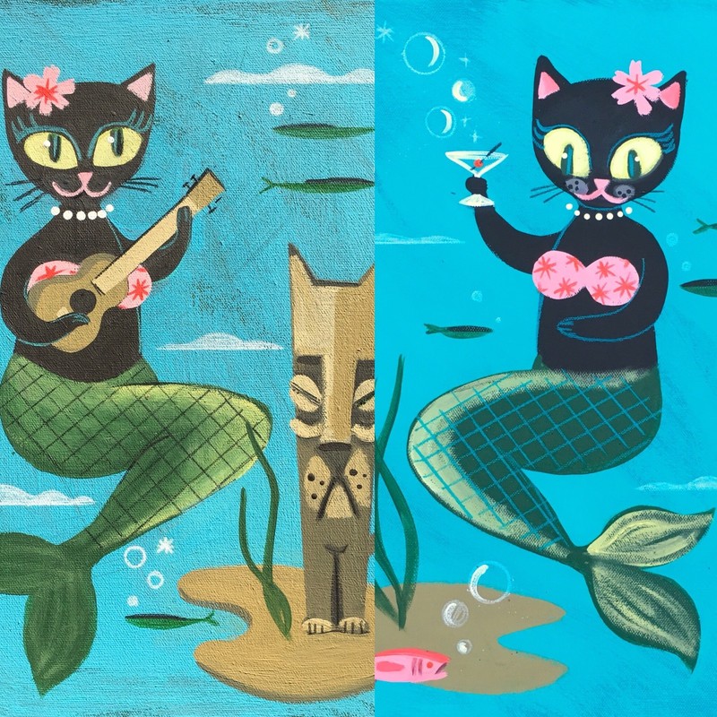 El Gato Gomez Print Retro Mermaid Hula Girl Kitty Cats Beach Tiki