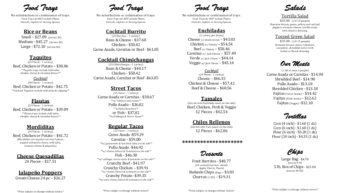 El Indio Mexican Restaurant Catering Menu