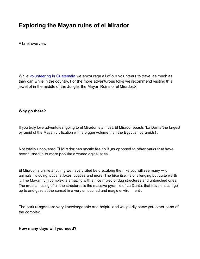 If you like mayan history and enjoy nature and hiking el mirador trek. But walking is faster and allows you to watch the nature more closely. In ancient times el mirador was a very large city much bigger than tikal yaxchilan or palenque. A detailed investigation was begun in 1978 with an archaeological project under the direction of bruce dahlin the catholic university of america and ray.