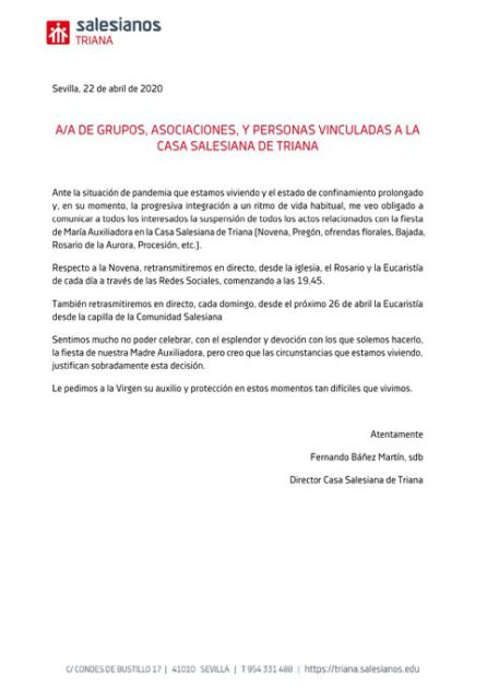Suspendida La Salida Procesional El 24 De Mayo De Maria