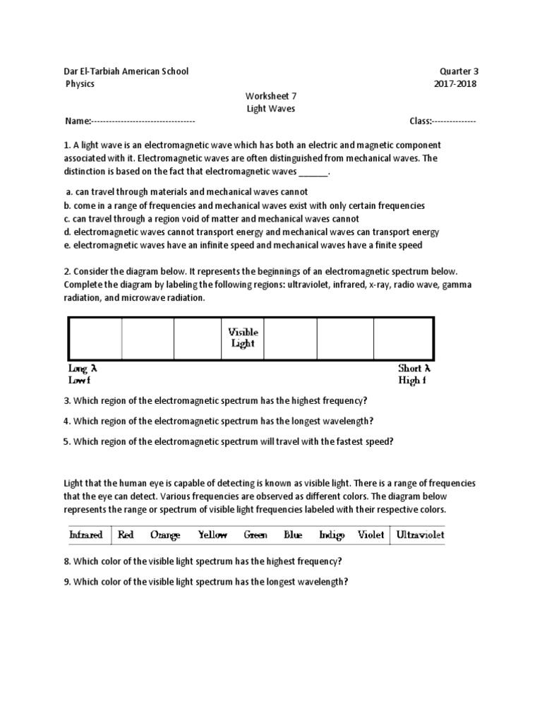 Worksheet 7 Light Waves