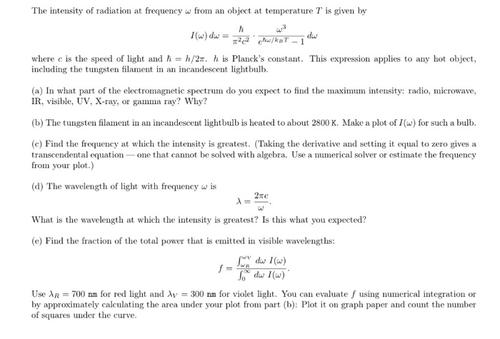 Solved The Intensity Of Radiation At Frequency W From An