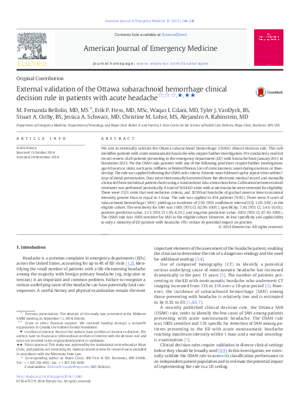 Pdf External Validation Of The Ottawa Subarachnoid Hemorrhage