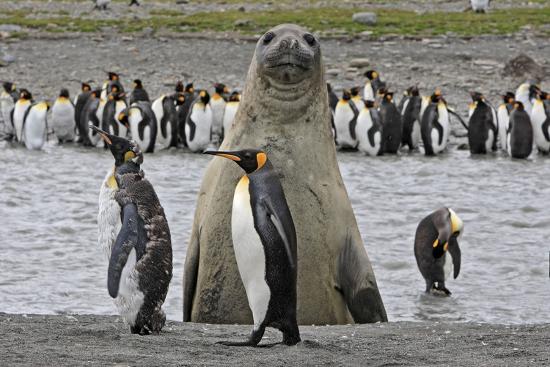 Southern Elephant Seal Showing Size Comparison With King Penguins
