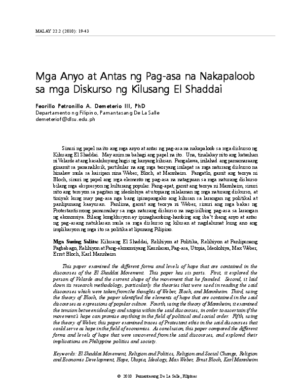 Pdf Mga Anyo At Antas Ng Pag Asa Na Nakapaloob Sa Mga Diskurso Ng