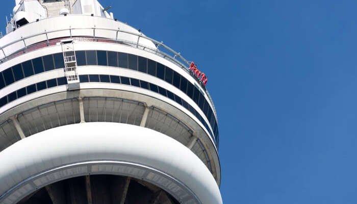Closeup Of The Cn Tower Showing People Edge Walking Around The